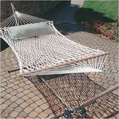 4961C/4780 Finish: Hunter Green Stand shown in Beige It's a sunny, lazy summer day and there's a warm, calming breeze outside. What to do? Step out the door into the comfort and convenience of your very own backyard and appreciate the splendor of a cotton rope hammock. Hammock Features: -Made of 100pct natural cotton rope -1/4'' cord thickness -Hardwood spreader bars -Hammock bed: 58'' W x 82'' D -13' overall length -The optional pillows, stand and wheel kit pictured above, are not included and need to be purchased separately. About Algoma Net Company The Algoma Net Company has been in business for over 100 years. Having been in business in three different centuries, Algoma is proud to present you with their selection of the finest designs in hammocks and other outdoor lifestyle products. The Algoma family of all-American crafted products is recognized for its quality, styling and value. No matter where or when you want to relax, make it an Algoma product!